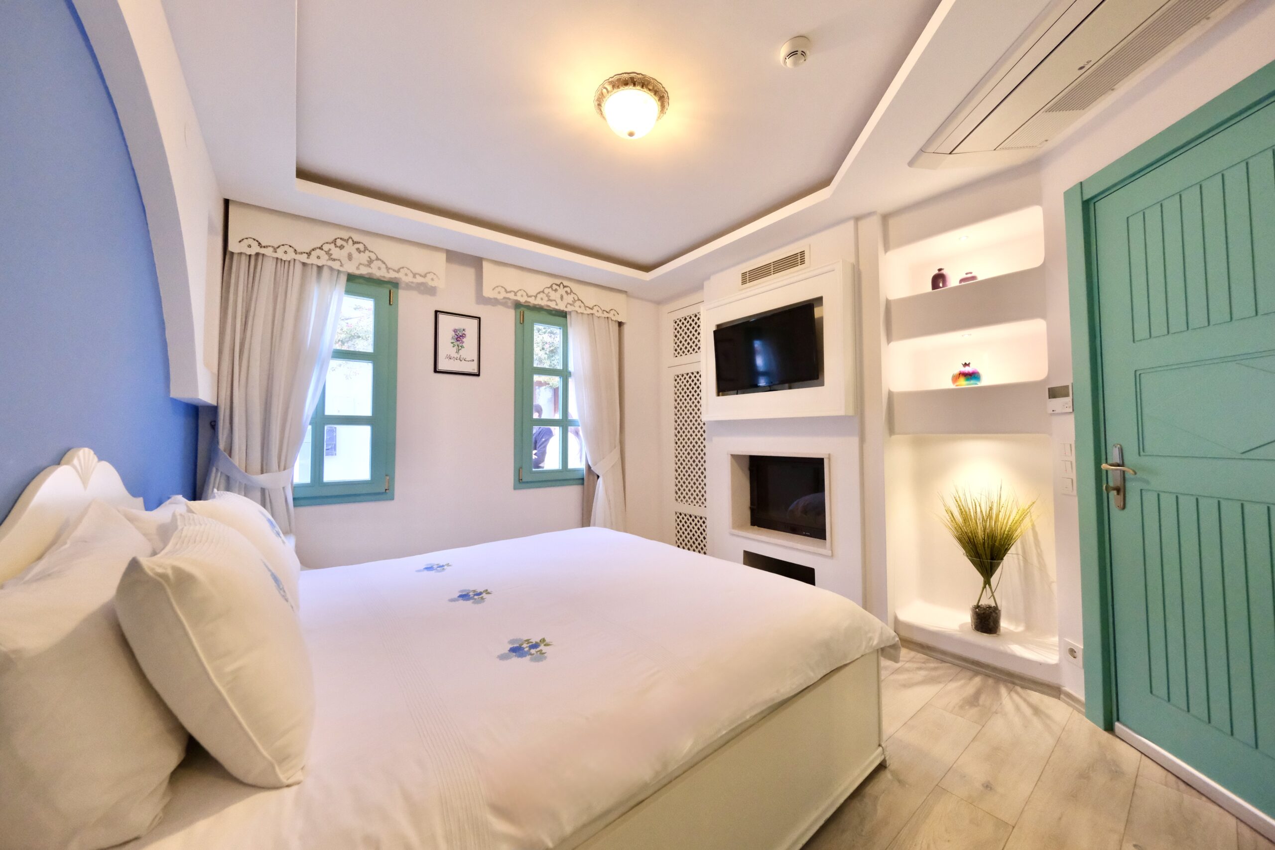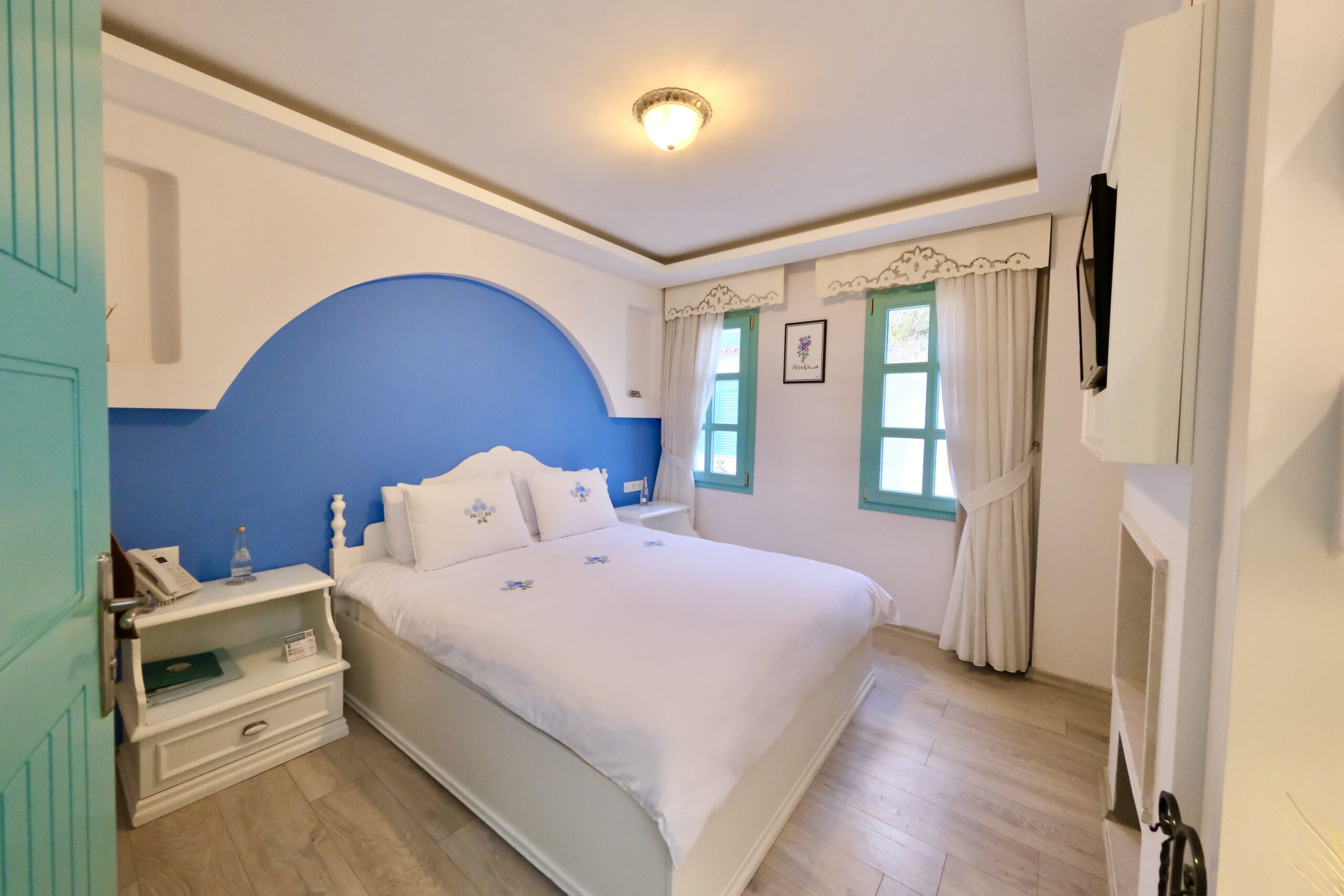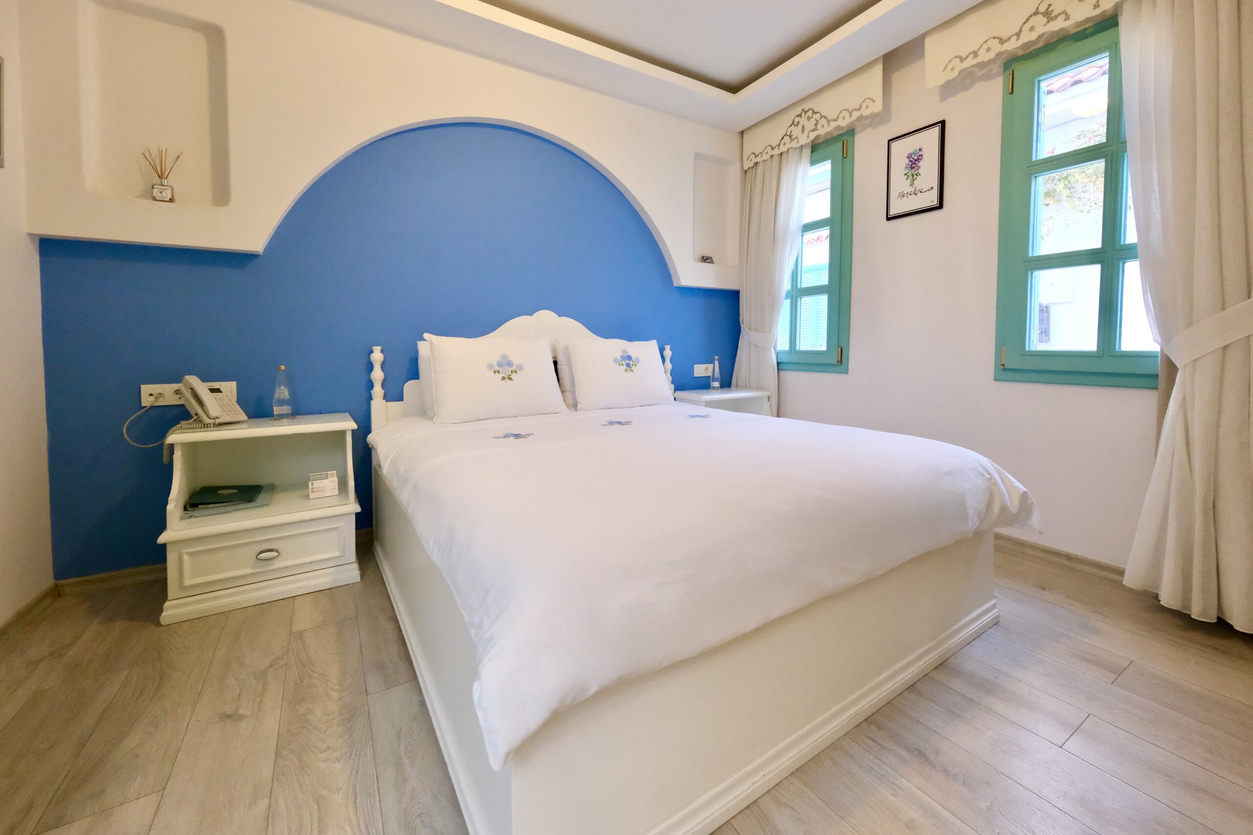 Giriş katındaki konumuyla kolay erişim sağlarken, yumuşak renkleri ve sade tasarımıyla sizi günlük hayatın yoğunluğundan uzaklaştırıyor. Deniz ve plaj keyfinden sonra Menekşe Odası’na dönmek adeta evinize dönmek gibi hissetirecek.